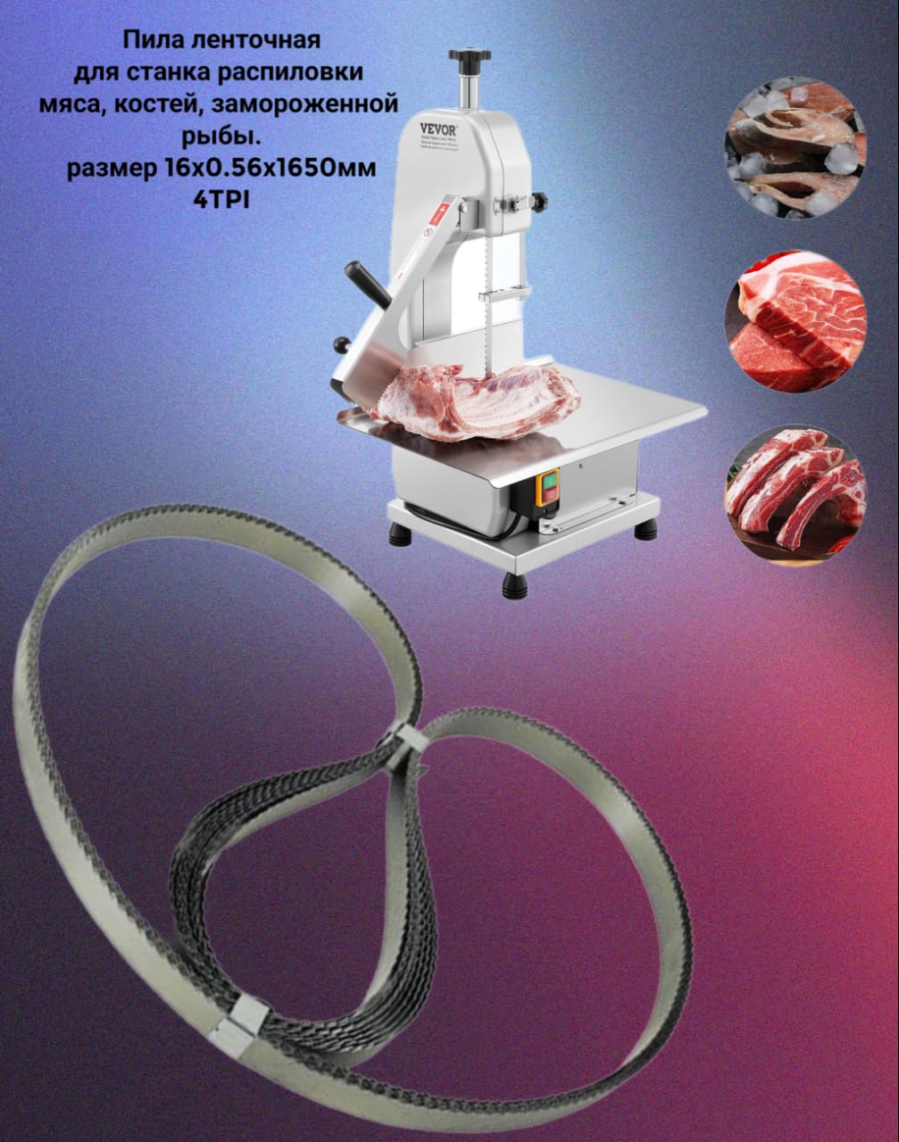 Пила ленточная предназначена для резки замороженного мяса, рыбы, костей. Длина пилы 1650 мм. Ширина пилы 16 мм. Толщина пилы 0.56 мм. Шаг зуба 4 TPI. В комплекте 3 пилы.